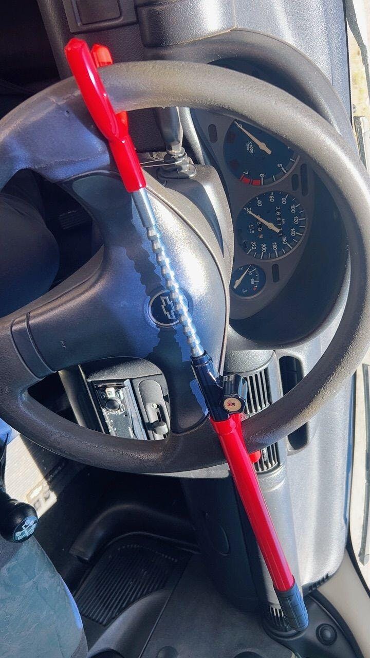 A Trava Antifurto funciona como uma espécie de “algema” que conecta dois pontos do veículo (por exemplo, volante + pedal ou volante + cinto ou somente o volante), impedindo que o motorista consiga girar o volante ou acionar corretamente os pedais.